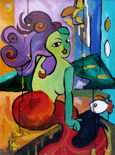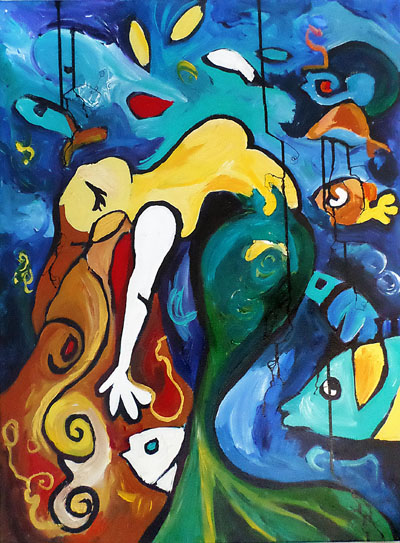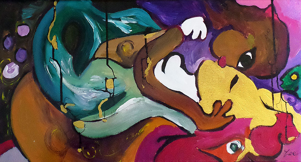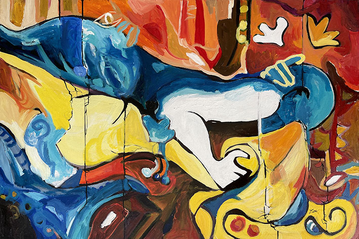 J’avais peint cette toile intitulée « les passionnés » lors de la création d’une série au sujet des sirènes que j’avais faite en 2017. Je vous confie ici que j’apprécie particulièrement le choix qu’ont fait les propriétaires des lieux pour ce tableau que j’aime particulièrement pour les raisons suivantes : Cette toile se présente comme une exploration vibrante et audacieuse des formes et des couleurs, une œuvre qui fusionne le surréalisme et l’abstraction avec une fluidité remarquable. Dès le premier coup d’œil, le spectateur est frappé par la juxtaposition des tonalités chaudes et froides, dominées par des bleus profonds et des jaunes éclatants. Ce contraste chromatique crée une tension dynamique, invitant à une réflexion sur les émotions conflictuelles que l’œuvre semble vouloir exprimer.