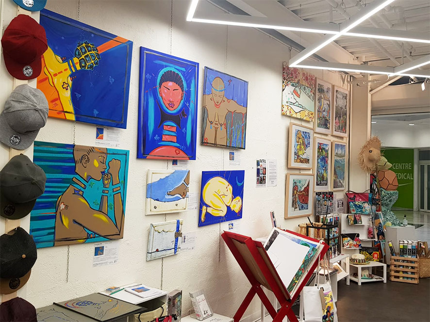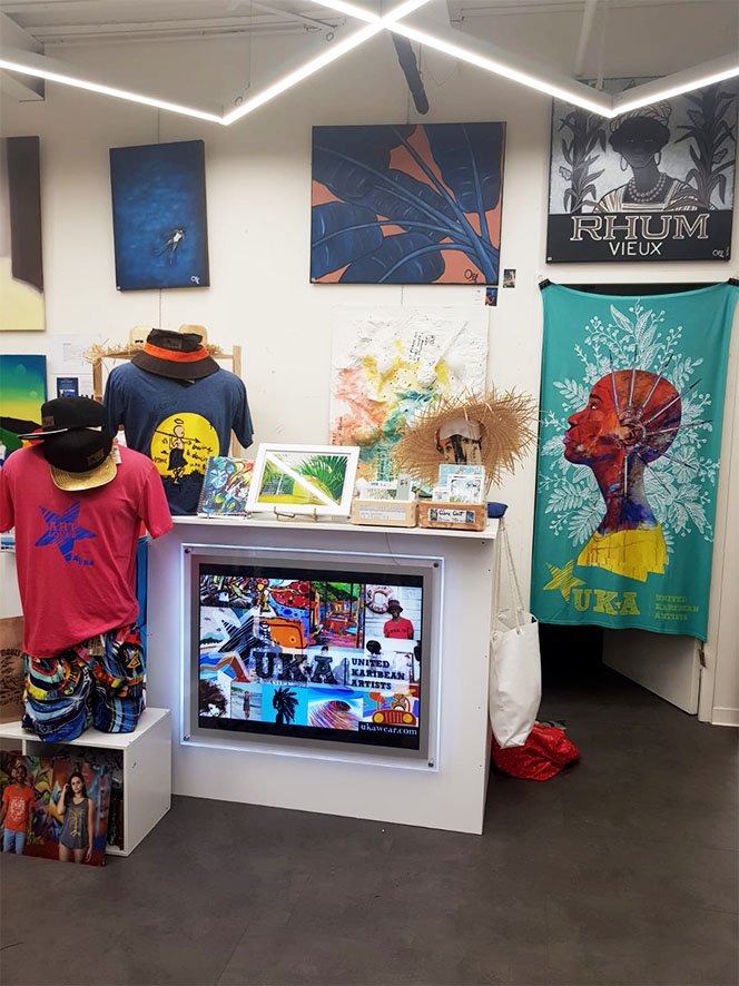 Depuis mai 2021, j’ai la chance d’être exposé chez UKA, un Pop Up Store à Destreland en Guadeloupe. C’est une galerie tout à fait moderne, le must des artistes guadeloupéens. Gonzo, le galeriste s’intéresse à tout ce qui a trait à l’art. Il aime les happenings, les artistes, les events, et est friand de tout ce qui se fait aujourd’hui et ce qui se fera demain. Il est dans le move ! Et ça se voit ! L’espace relativement petit, fourmille de toiles, d’objets artisanaux ou d’art, de vêtements très branchés et de tee-shirt à la surf mania. Alors qu’attendez vous ? Prenez un bain de « djeuns » attitude à UKA !