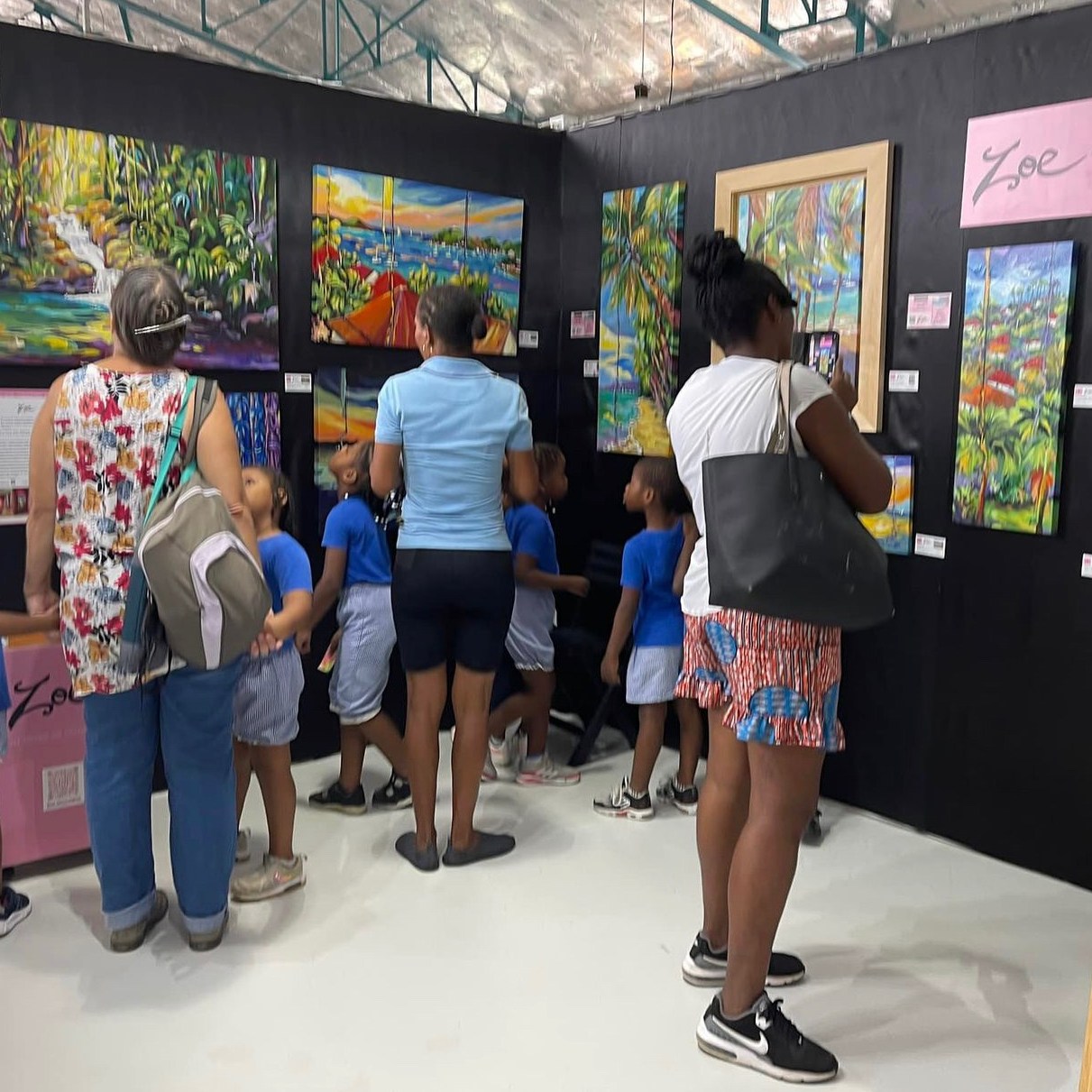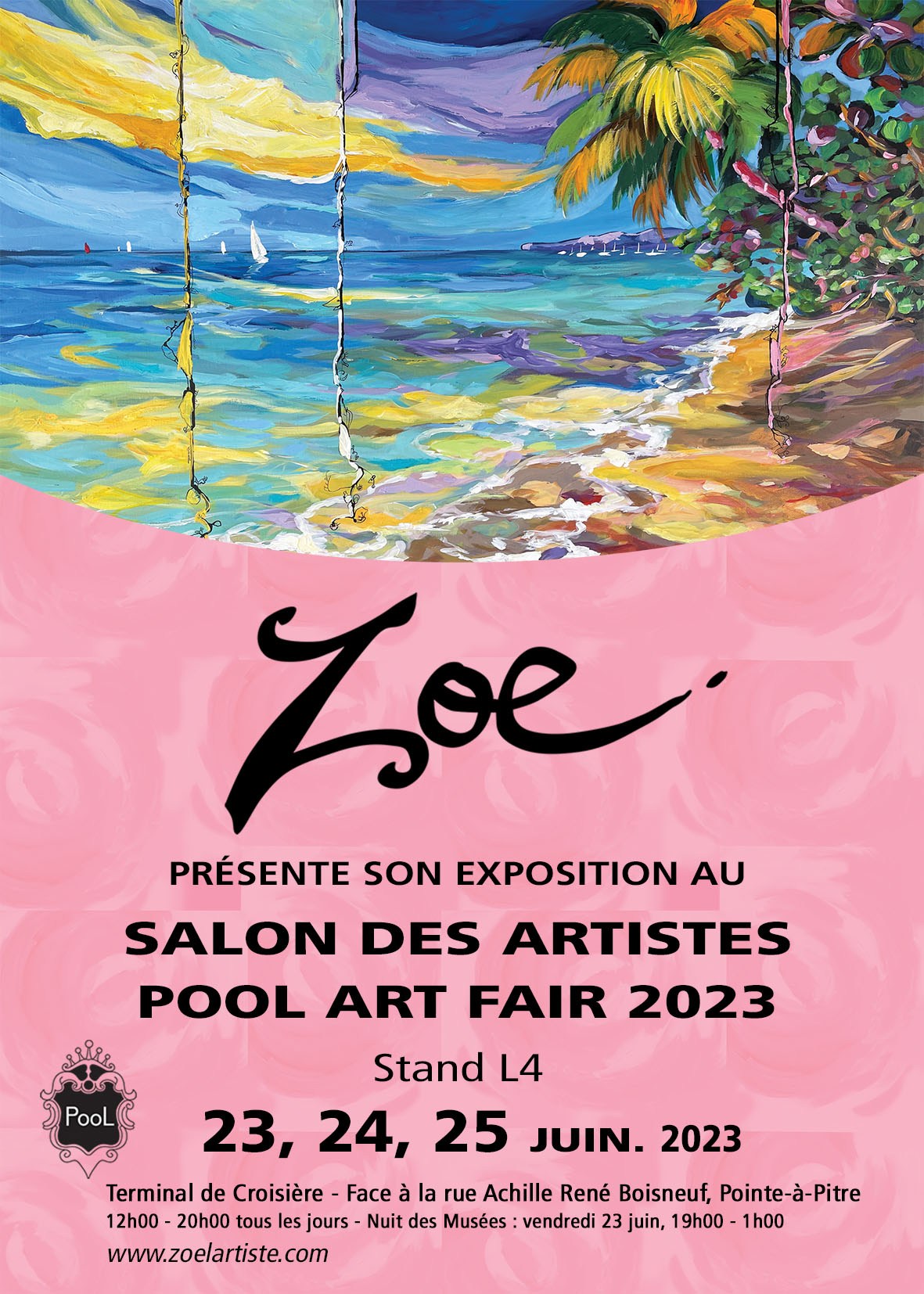 Après plusieurs années d’absence en raison de la pandémie, la Pool Art Fair a fait un retour triomphal en Guadeloupe. L’événement a rassemblé un public nombreux et enthousiaste, heureux de retrouver l’échange direct avec les artistes présents. Zoé, pleinement investie, a intensifié sa production picturale pour cette occasion majeure et a redoublé d’efforts côté communication, partageant massivement ses œuvres sur Instagram et Facebook. Elle a même accepté une interview radio sur Guadeloupe Première, un fait assez exceptionnel pour cette artiste gaffeuse, souvent surnommée par sa famille la « Bridget Jones de la Guadeloupe » pour ses maladresses attendrissantes.